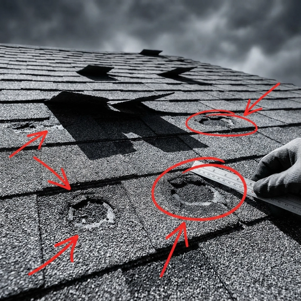 Metal damage: Check gutters, flashing, and vents for similar dents